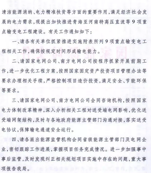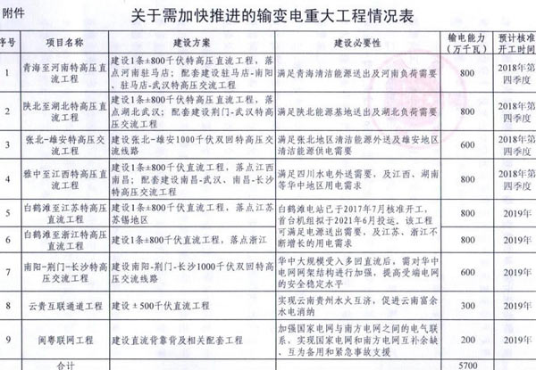 9月7日獲悉,國家能源局印發(fā)《關(guān)于加快推進(jìn)一批輸變電重點(diǎn)工程規劃建設工作的通知》國能發(fā)電力〔2018〕70號,《通知》指出,為加大基礎設施領(lǐng)域補短板力度,發(fā)揮重點(diǎn)電網(wǎng)工程在優(yōu)化投資結構、清潔能源消納、電力精準扶貧等方面的重要作用,加快推進(jìn)青海至河南特高壓直流、白鶴灘至江蘇、白鶴灘至浙江特高壓直流等9項重點(diǎn)輸變電工程建設,合計輸電能力5700萬(wàn)千瓦(工程見(jiàn)附件)。