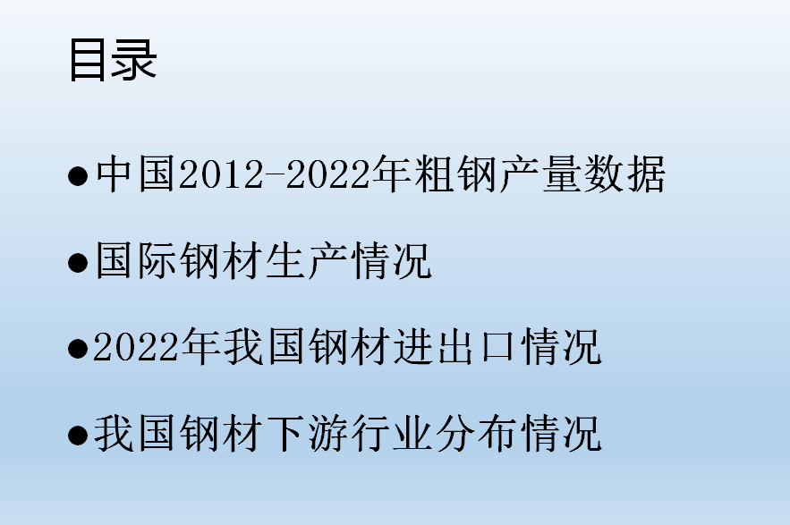 •我國現階段已經(jīng)初步實(shí)現城鎮化的建設,隨著(zhù)房地產(chǎn)需求的下滑,我們普通鋼材很難有一個(gè)大的增量,但是我國的特殊鋼材還有很大的發(fā)展空間。結合國家鋼材發(fā)展現狀,我們也慢慢的理解公司制定“高端、國有、人無(wú)我有”政策的現實(shí)依據,希望大家能出通過(guò)了解行業(yè)發(fā)展的方向,明確目標,開(kāi)發(fā)客戶(hù),更好的規劃自己的銷(xiāo)售,取得好的業(yè)績(jì)。